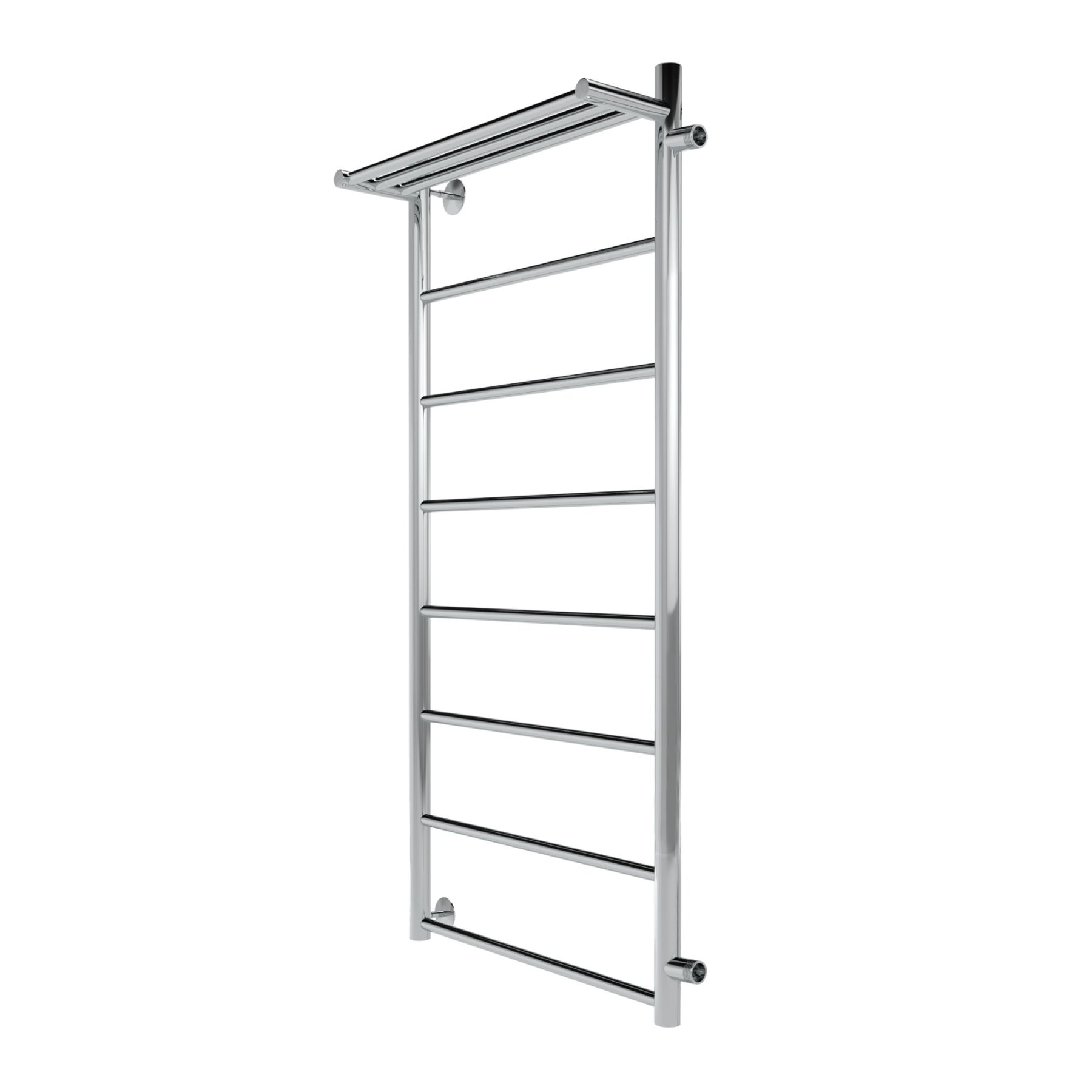 Водяной полотенцесушитель в форме Лесенки Line с полочкой – это оригинальный элемент не только с прямыми или накладными перекладинами, но и дополнительной полкой для полотенец, халатов и других мелочей.