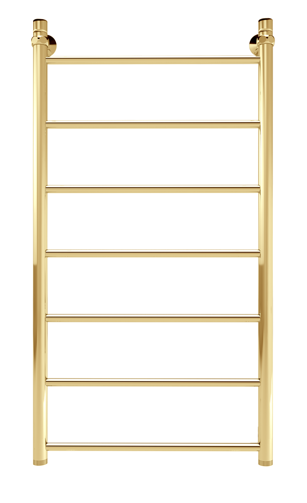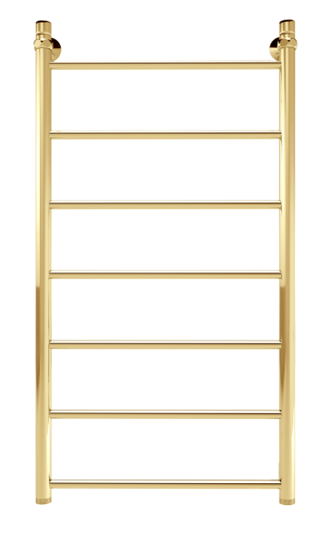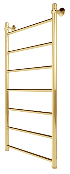 Водяной полотенцесушитель серии «Лесенка» Line золотого оттенка с безупречным блеском. Простой, но стильный, изготовлен из высококачественной нержавеющей стали. Идеально сочетается с золотой сантехникой или интерьером в классическом стиле.
