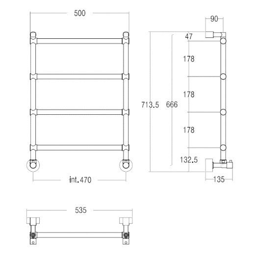 Водяной полотенцесушитель 535х713 мм (черный матовый). 4 секции, материал - латунь, допустимая температура воды: max 95 °С, максимальное рабочее давление: 6 атм, диаметр латунной трубы: 25 мм, расстояние от стены: 135 мм, расстояние между центрами (int.): 470 мм, подключение: 1/2″ (внешняя резьба).