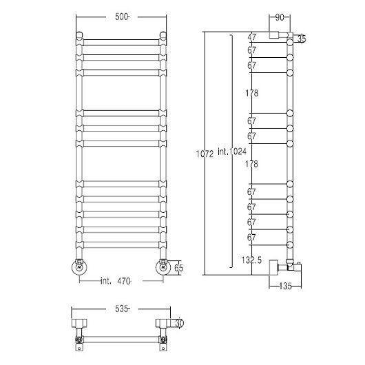 Допустимая температура воды: max 95 °С, максимальное рабочее давление: 6 атм, диаметр латунной трубы: 25 мм, количество секций: 11 шт, расстояние от стены: 135 мм, расстояние между центрами: 470, подключение: 1/2″ (внешняя резьба), гарантия 1 год, Италия.