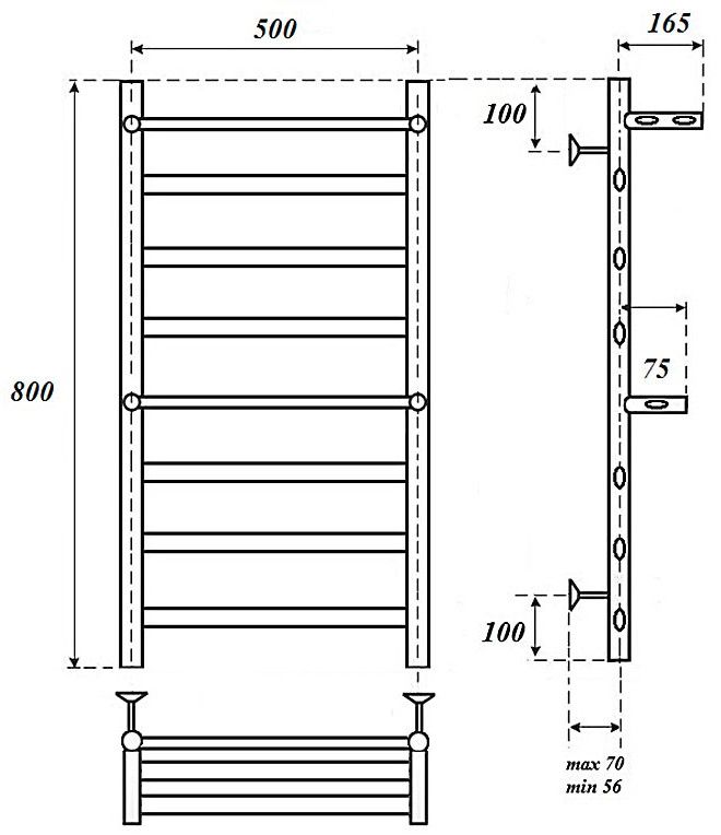 Водяные полотенцесушители Артемида выполнены из нержавеющей стали AISI 304L с толщиной стенки 2,0 мм в трех размерах 500x600, 500х800 и 500х1000 мм.
