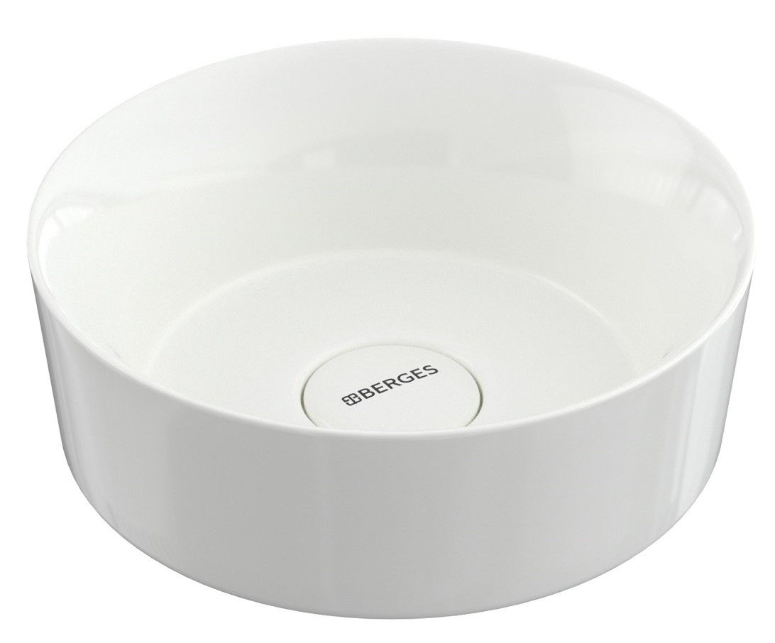 Накладная раковина из санфарфора Berges Mascon диаметром 38 см.Высота 12,5 см.Круглой формы, без отверстия под смеситель, глянцевая белая.Керамическая крышка слива в комплекте.