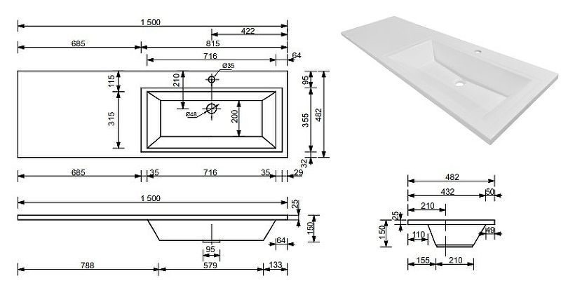 Размеры (ШхВхГ): 1500х150х482 мм.