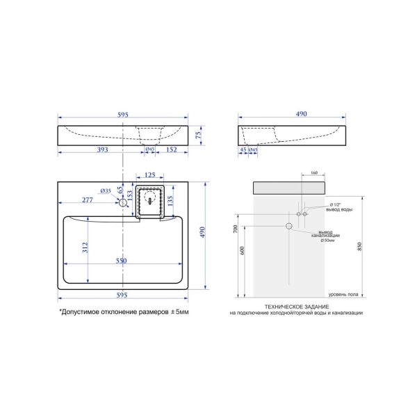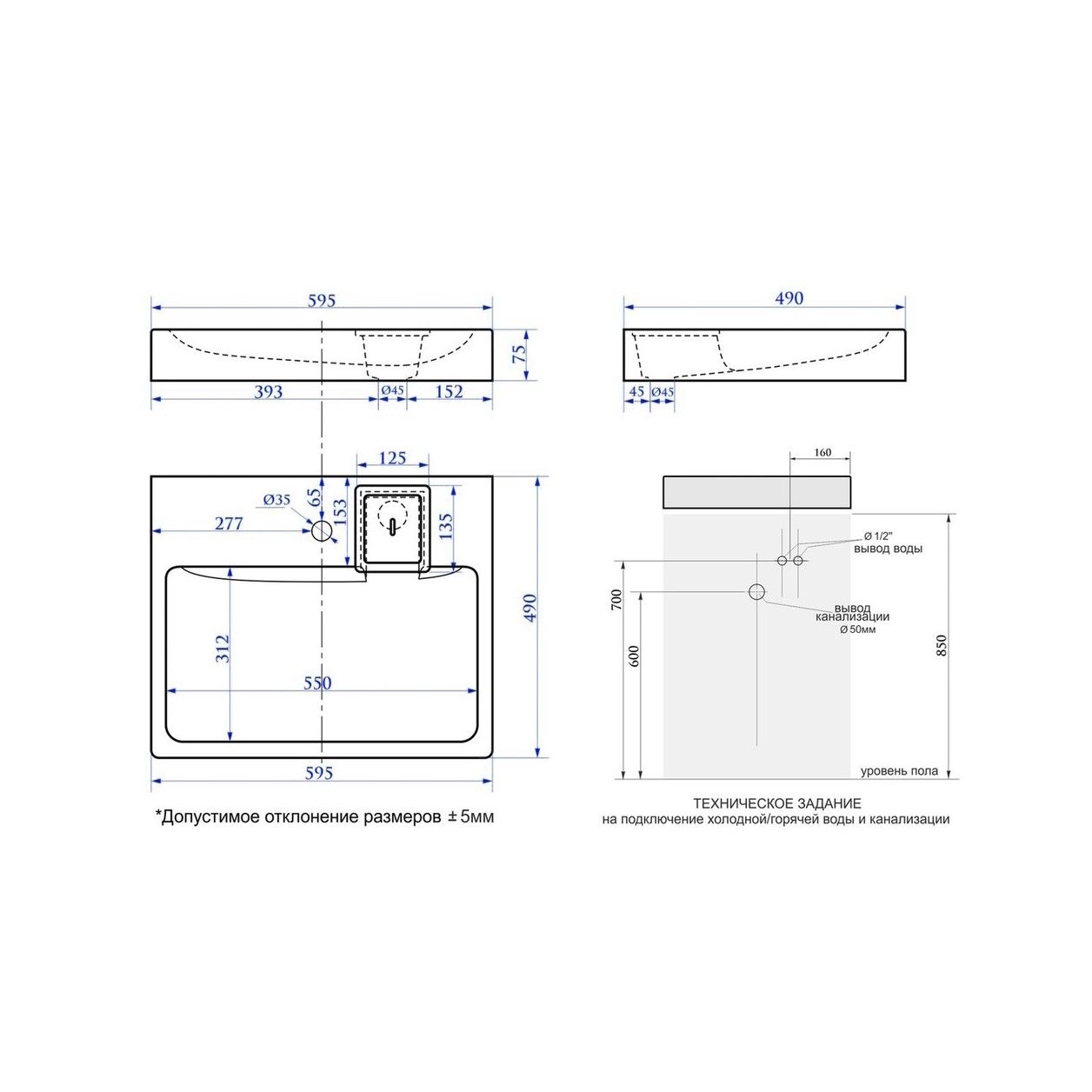 • Отверстия под смеситель: