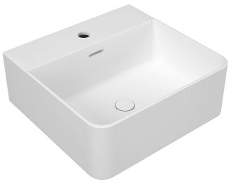 Стильная свободностоящая раковина с переливом и отверстием под смеситель по центру. Устанавливается на столешнице. В комплект входит сливной выпуск с донным клапаном.