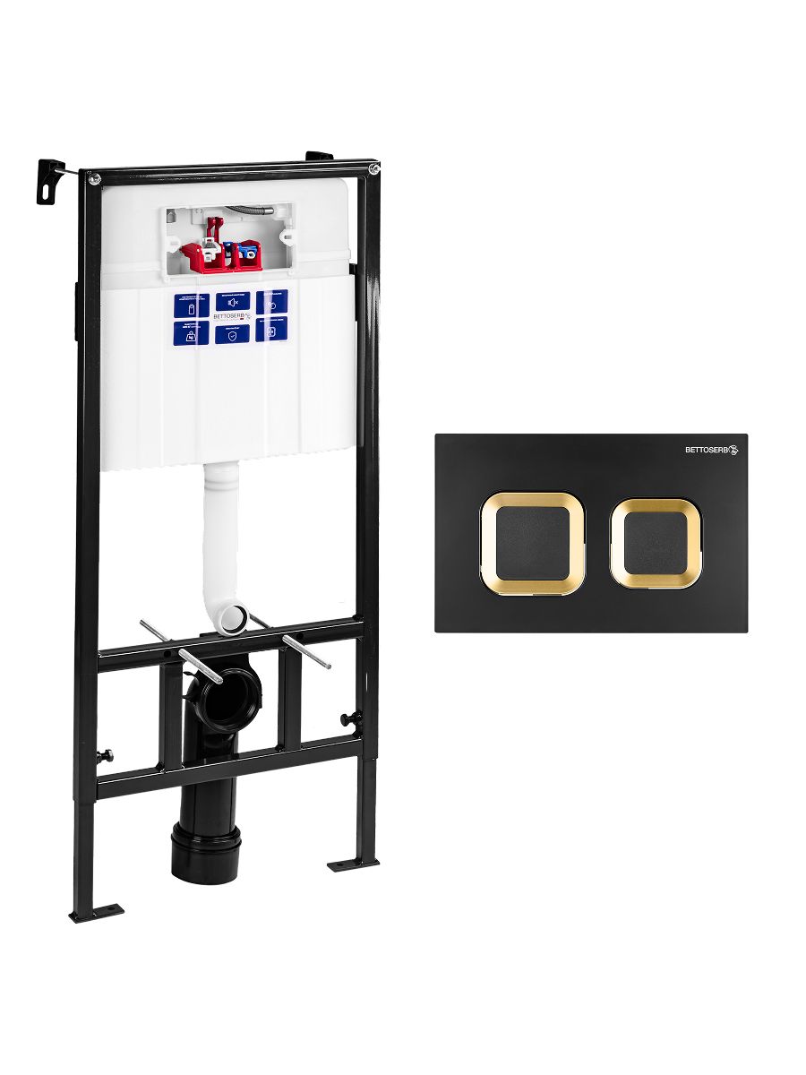 Система инсталляции для унитаза Bettoserb Fix Slim с клавишей смыва BETTOSERB COOL Современное решение для вашего санузла – надежность, стиль и экономия воды!Bettoserb Fix Slim – это высококачественная европейская инсталляция для подвесных унитазов, сочетающая прочность, универсальность и бесшумную работу. Система крепится к полу и стене, выдерживая нагрузку до 400 кг, и подходит для большинства моделей унитазов благодаря регулируемому межосевому расстоянию (18/23 см) и настройке по высоте.Ключевые преимущества инсталляции:? Прочная конструкция – рама с порошковым покрытием, устойчивым к коррозии? Тихая работа – звукоизоляционная прокладка и бесшумный заправочный клапан? Экономия воды – эффективный смыв с минимальным расходом? Герметичный бачок – защита от конденсата и протечек? Надежный механизм – 200 000+ циклов смыва без поломок? Гибкое подключение – верхнее или боковое (правая/средняя сторона)? Полная комплектация – все крепежи для быстрого монтажаКлавиша смыва BETTOSERB SMART Чёрный матовый + Золото глянец Роскошный акцент для современного санузла – клавиша смыва BETTOSERB SMART сочетает благородный матовый чёрный с элегантным золотым глянцем. Эксклюзивные особенности: ? Контрастное покрытие – матовая чёрная основа с золотистыми глянцевыми элементами? Премиум-механизм SMART – плавный ход с чёткой тактильной отдачей? Стильный геометрический дизайн – современные чёткие линии? Антивандальное исполнение – устойчивость к царапинам и отпечаткам Технические преимущества:? Металлическая основа с защитным покрытием? Ресурс работы – 100 000 циклов? Устойчивость к коррозии и влаге? Простота очистки – не требует специального ухода Идеально для:• Дизайнерских интерьеров• Премиальных санузлов• Пространств в стиле luxury Добавьте нотку роскоши в ванную комнату! Доступна для заказа с бесплатной доставкой по РФ.