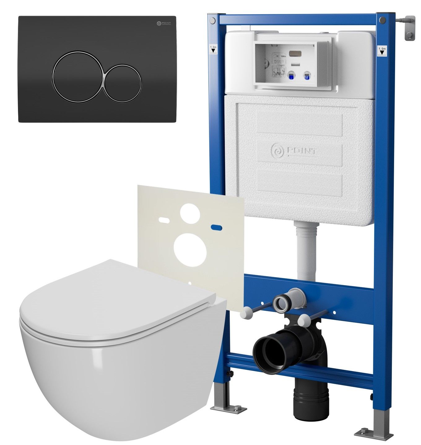 Сет: Система инсталляции Point Элемент для подвесного унитаза PN45120 + Клавиша смыва для инсталляции Point Виктория, черная/хром, PN44061BC + Унитаз подвесной Point Афина безободковый, сиденье микролифт PN41041