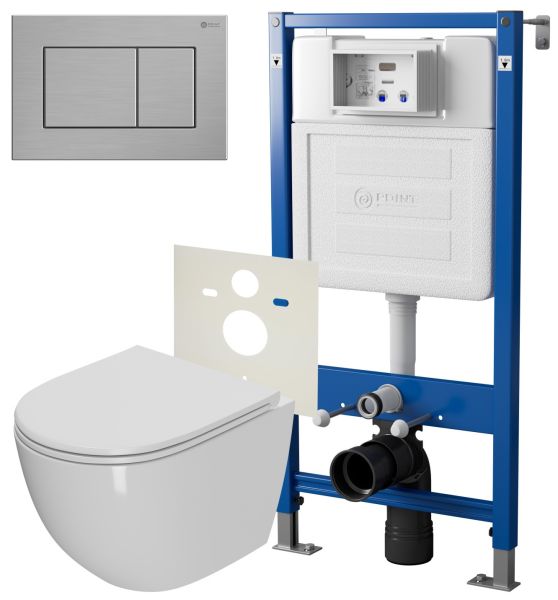 Сет: Система инсталляции Point Элемент для подвесного унитаза PN45120 + Клавиша смыва для инсталляции Point Ника, нержавеющая сталь, сталь брашированная, PN44081SB + Унитаз подвесной Point Афина безободковый, сиденье микролифт PN41041
