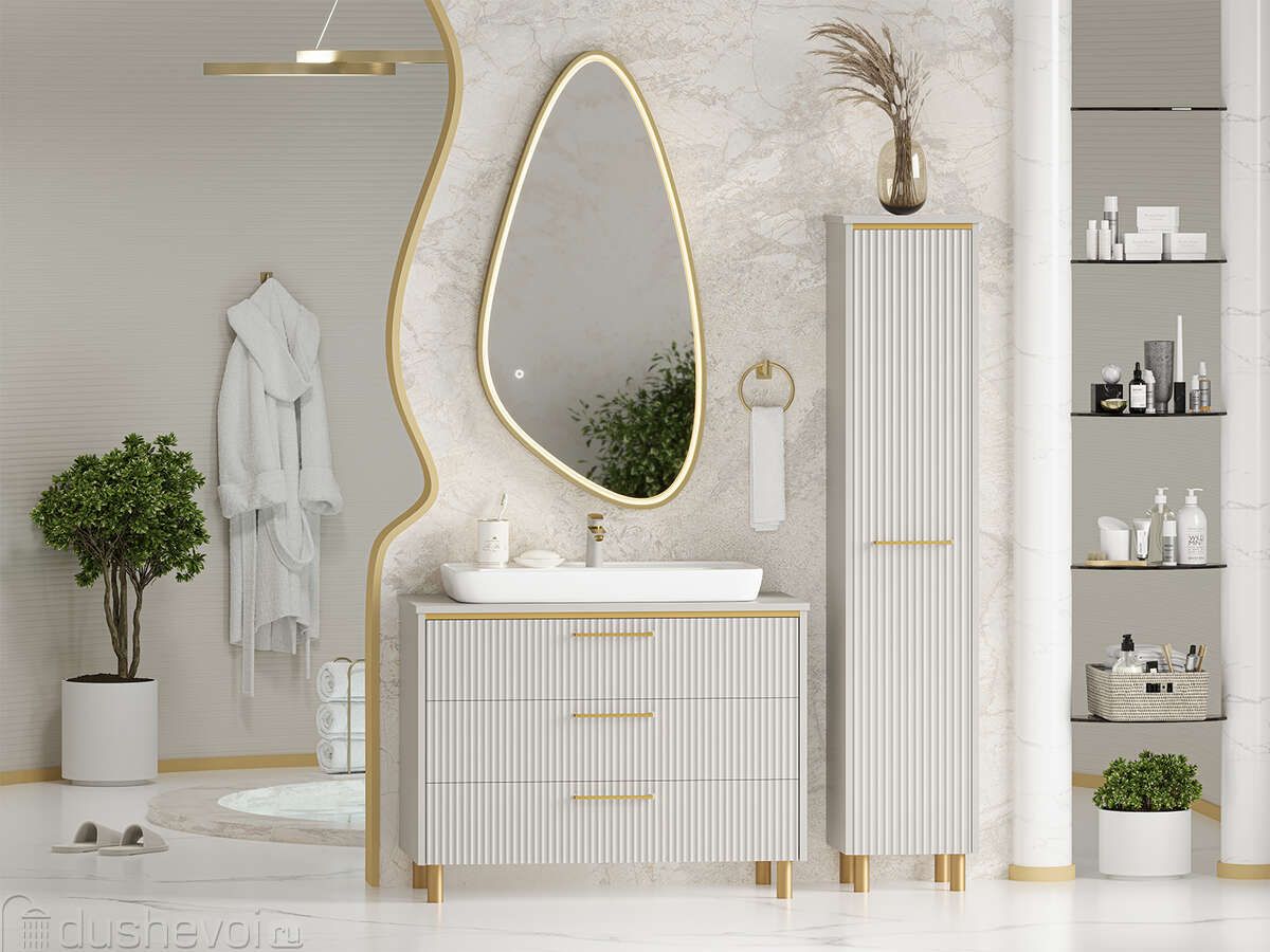Шкаф - пенал Brevita Elche 35 R ELC-05035-010R Серый кашемир Золото Уникальные формы и гармоничные линии коллекции Elche гармонично сочетают в себе элегантность и практичность, создавая неповторимую атмосферу уюта и роскоши. Каждый предмет мебели для ванной из коллекции Elche изготовлен из высококачественных материалов, прошедших строгий контроль качества, что гарантирует их долговечность и надежность. Влагостойкие фасады, прочная фурнитура и износостойкие поверхности - все это обеспечивает максимальный комфорт и удобство   в использовании на протяжении долгих лет. Характеристики: