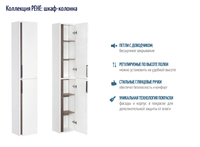 Шкаф-пенал Акватон Рене подвесной отлично впишется в дизайн любой ванной комнаты, будь то компактная ванная в многоэтажном доме или большой санузел в загородном коттедже. Подвесной способ установки дает возможность не только визуально увеличить пространство, но и обеспечивает быстрый и удобный доступ для уборки.Компания Акватон использует при производстве высококачественные водоотталкивающие материалы (МДФ), соответствующие всем необходимым требованиям безопасности. Коллекция Рене выполнена в эксклюзивном дизайнерском решении в лучших традициях современного стиля. Белый, основной цвет исполнения Акватон Рене, отлично подходящий большинству дизайнерских решений. Шкаф-пенал предусматривает удобную и вместительную систему хранения, состоящую из дверей. Важные габариты изделия: ширина 31 см, глубина 25 см, высота 169.4 см.Россия родина бренда Акватон, вся продукция производится со строгим соблюдением всех стандартов, благодаря чему можно быть абсолютно уверенным в надежности и высоком качестве. Шкаф-пенал Акватон Рене подвесной создаст уют и комфорт в любом дизайнерском решении, и ванная комната обретет неповторимый элемент интерьера.