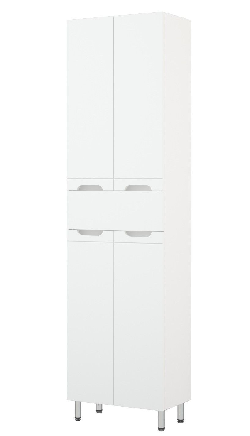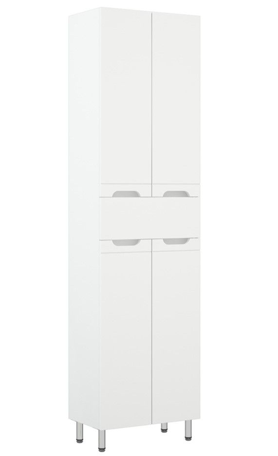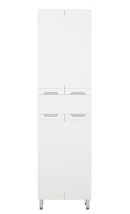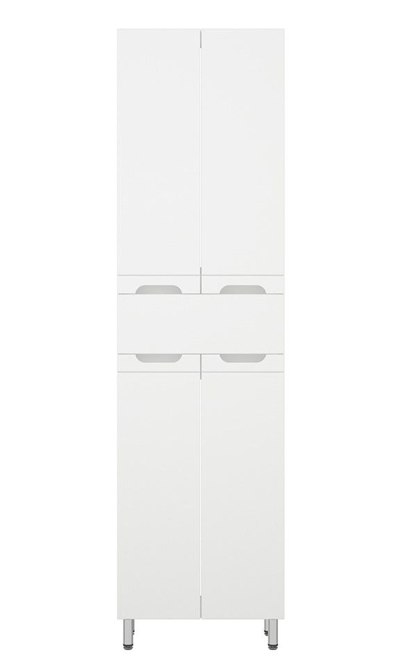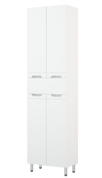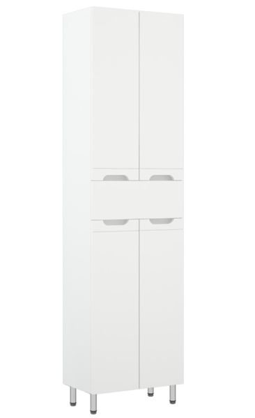 Шкаф-пенал Corozo Лея 50 Z1, 50 см, цвет белый, SD-00000001Коллекция мебели для ванных комнат "ЛЕЯ" создана для тех, кто ценит простоту форм, сочетание округлых и прямых линий, удобство эксплуатации. У мебели коллекции «ЛЕЯ» корпус выполнен из ЛДСП, фасады - из влагостойкой плиты МДФ, покрытие – пленка ПВХ. Мебель оснащена доводчиками. Модель пенала разделена на две автономные секции, на которых предусмотрено по две распашные дверцы и один выдвижной ящик высотой 160 мм по центру. Позади створок - по одной вкладной полке. Устойчивость конструкции обеспечивают четыре металлических хромированных опоры. Фурнитура с лицевой стороны фасадов отсутствует, вместо нее предусмотрены интегрированные ручки с декоративной полосой тонкой фрезеровки. Бесшумность и долговечность эксплуатации обеспечивают надёжные системы мягкого закрывания – роликовые направляющие и петли с доводчиками.