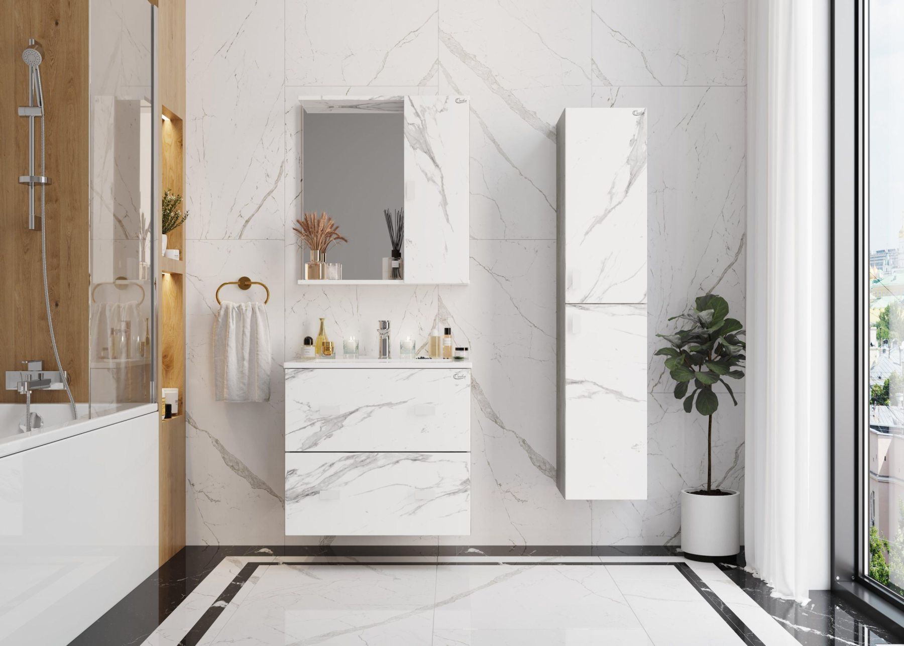 Шкаф-зеркало МАРБЛ 65 станет стильным и функциональным элементом пространства современной ванной комнаты. Спроектированный дизайнерами в минималистичном облике, зеркальный шкаф отражает самые актуальные расцветки сезона - бетон и мрамор.