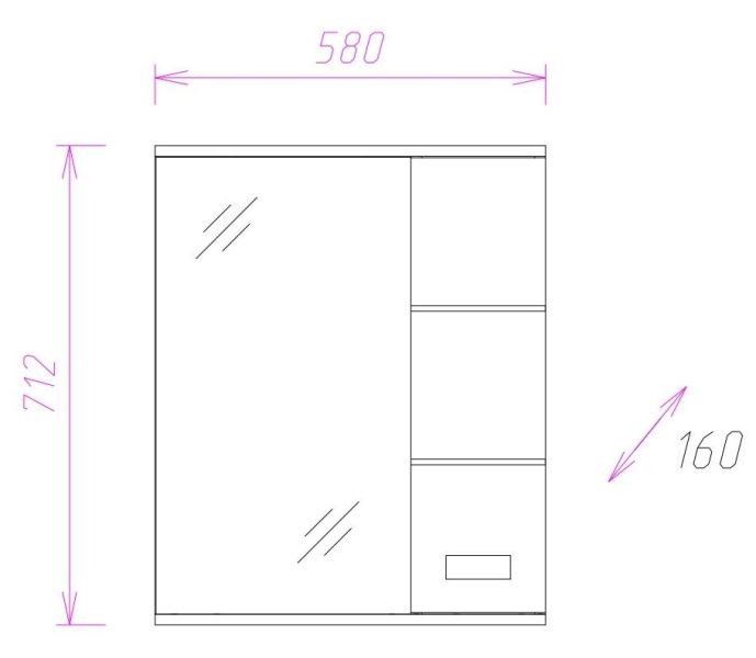 Слева от зеркала за распашной дверцей с механизмом плавного закрывания расположено отделение для хранения, разделенное на две части горизонтальной полочкой, под зеркалом - открытая полочка для косметических средств или декоративных элементов.