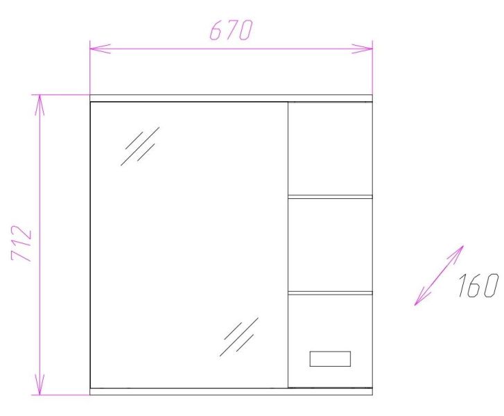 Слева от зеркала за распашной дверцей с механизмом плавного закрывания расположено отделение для хранения, разделенное на две части горизонтальной полочкой, под зеркалом - открытая полочка для косметических средств или декоративных элементов.