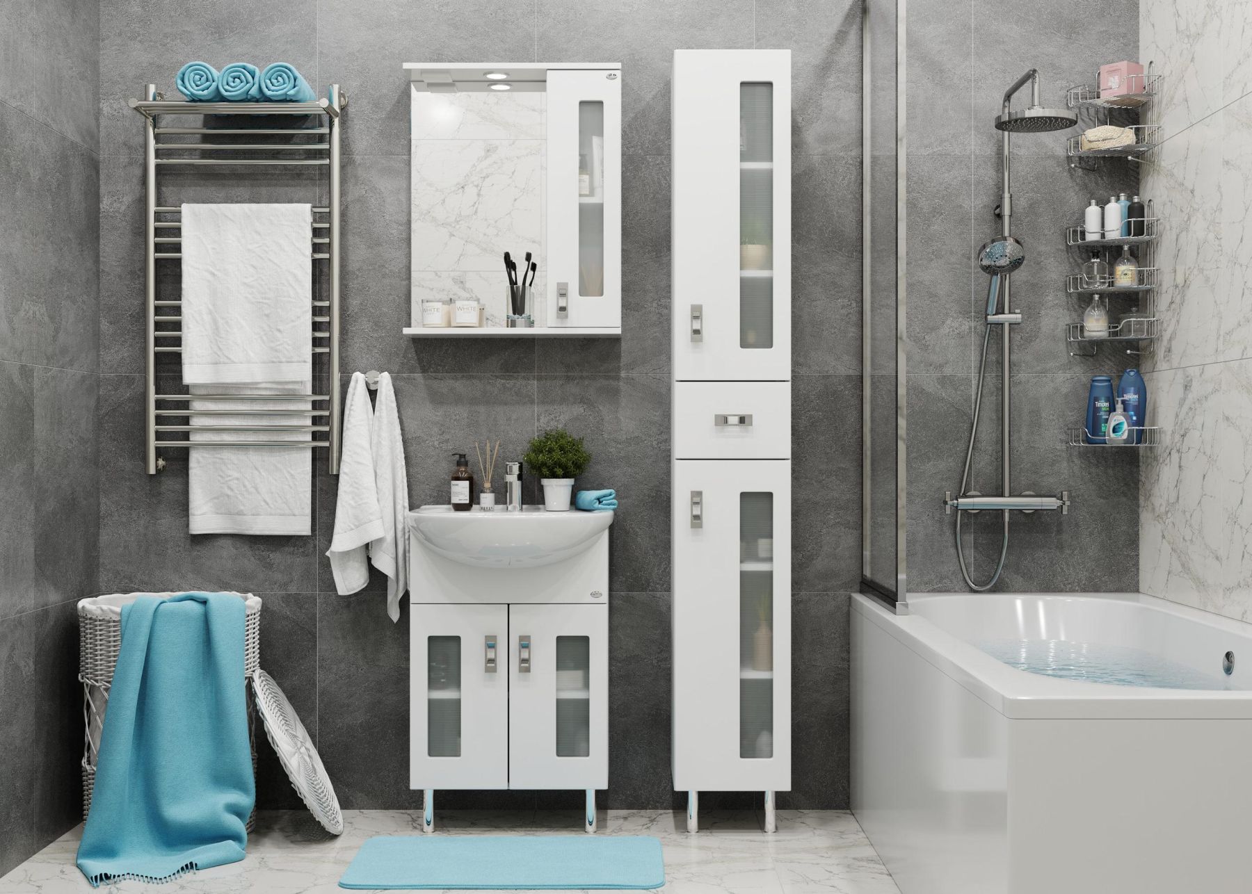 Белоснежный цвет фасада в сочетании со вставками из матового стекла и хромированными ручками необычной формы придадут ванной комнате ощущение свежести, чистоты и уюта.