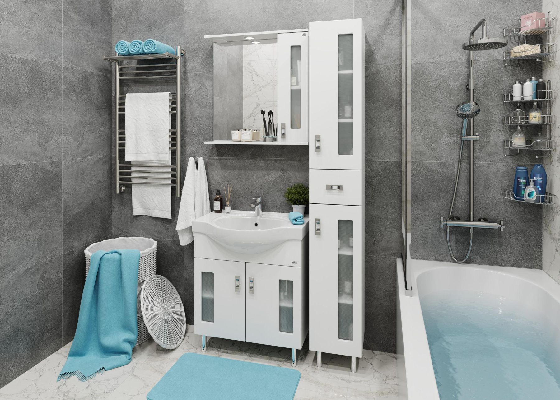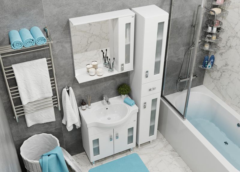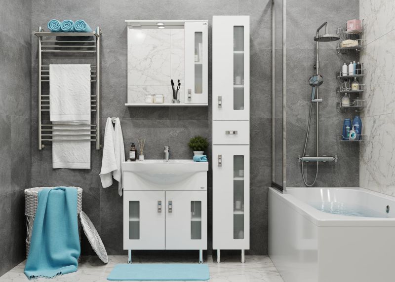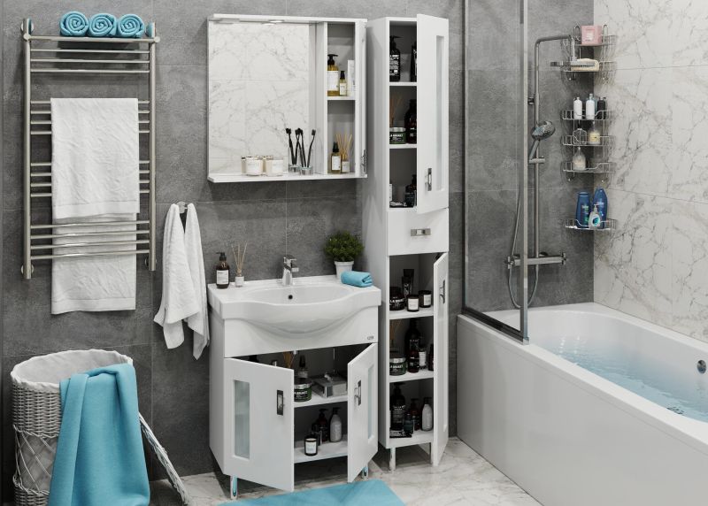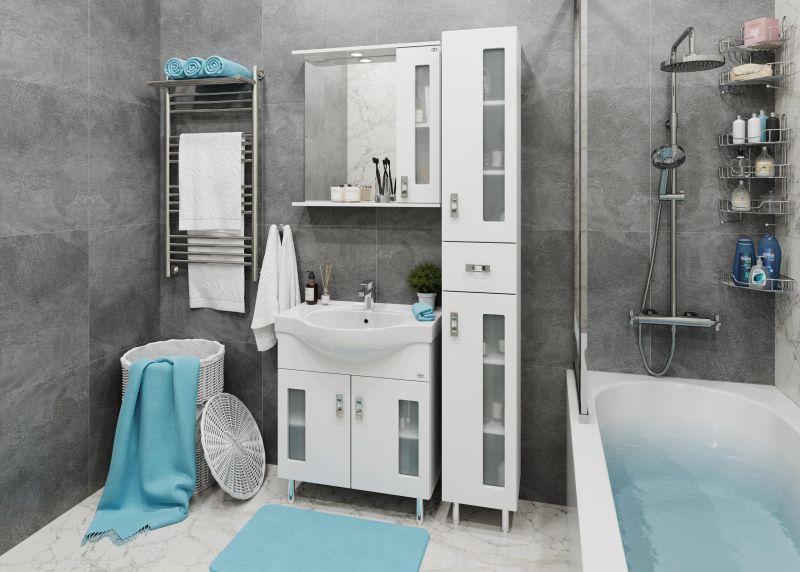 Белоснежный цвет фасада в сочетании со вставками из матового стекла и хромированными ручками необычной формы придадут ванной комнате ощущение свежести, чистоты и уюта.