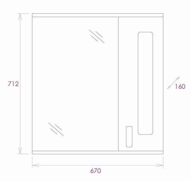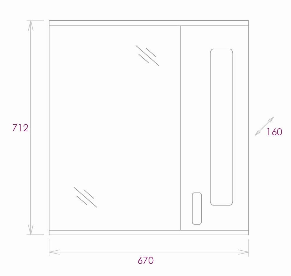 Справа от зеркала за распашной дверцей с механизмом плавного закрывания расположено отделение для хранения, разделенное полкой, под зеркалом - открытая полочка для косметических средств или декоративных элементов.