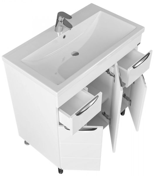 Слева от зеркала за распашной дверцей с механизмом плавного закрывания расположено отделение для хранения, под зеркалом - открытая полочка для косметических средств или декоративных элементов.