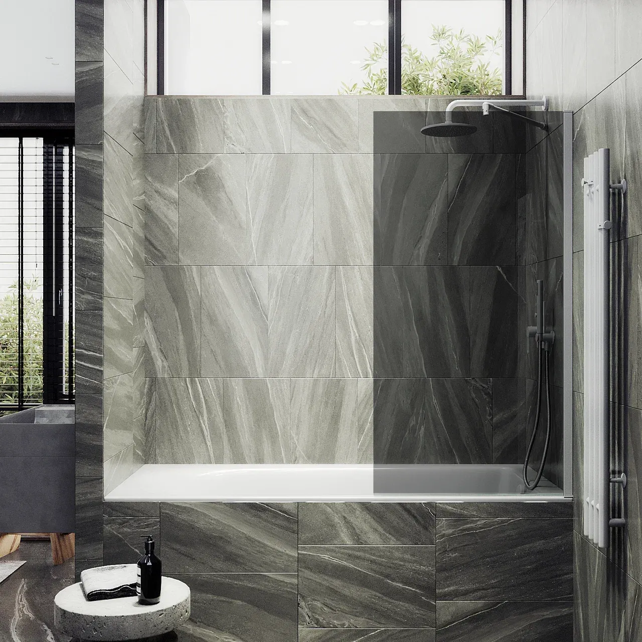 Монтаж осуществляется с помощью алюминиевого профиля, что обеспечивает надежность крепления и безопасность использования стеклянной перегородки для ванной. Также, шторка оснащена специальным уплотнителем, который предотвращает попадание воды на пол ванной комнаты. Закаленное стекло, цвет Графит, толщина 8 мм 1400х700 мм - 1 шт.