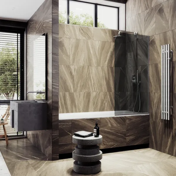 Монтаж осуществляется с помощью алюминиевого профиля, что обеспечивает надежность крепления и безопасность использования стеклянной перегородки для ванной. Также, шторка оснащена специальным уплотнителем, который предотвращает попадание воды на пол ванной комнаты. Закаленное стекло, цвет Графит, толщина 8 мм 1400х700 мм - 1 шт.