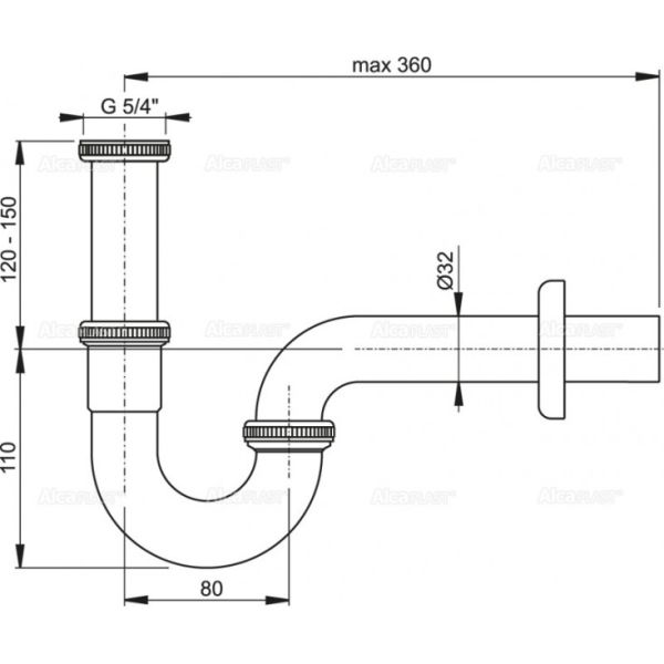 Сифон для раковины AlcaPlast ?32 U-форма цельнометаллический с накидной гайкой 5/4" A4320