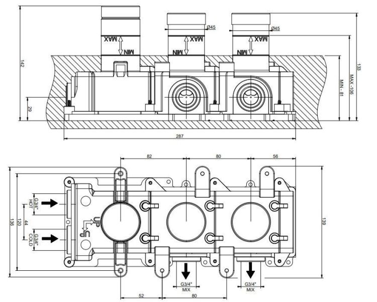 Два выхода позволяют подключать два различных источника воды, что значительно расширяет функциональность и удобство эксплуатации. Удобное управление потоком и температурой воды делает использование продукта простым и интуитивно понятным. Скрытая установка добавляет эстетическую гармонию и упрощает уход за сантехникой, так как все элементы находятся за стеной.