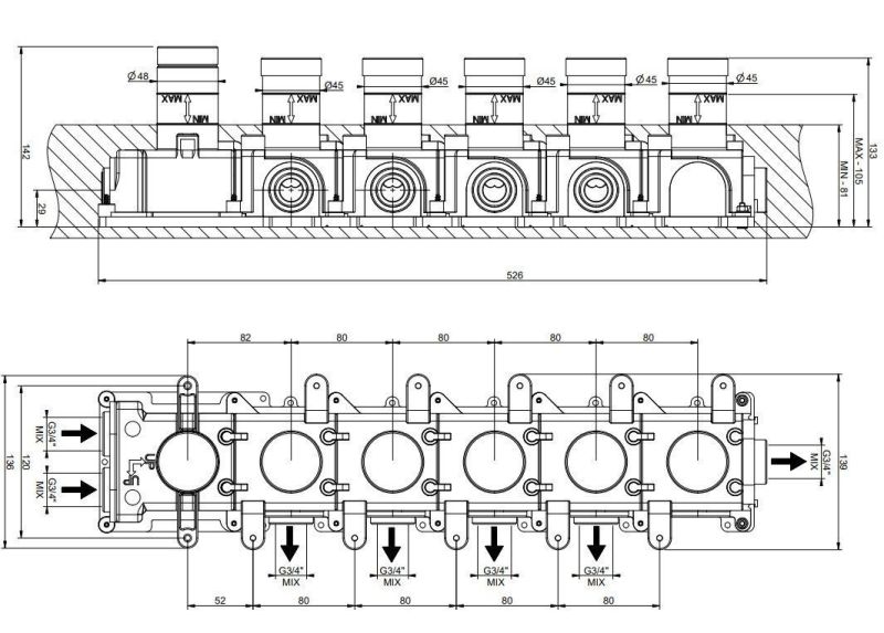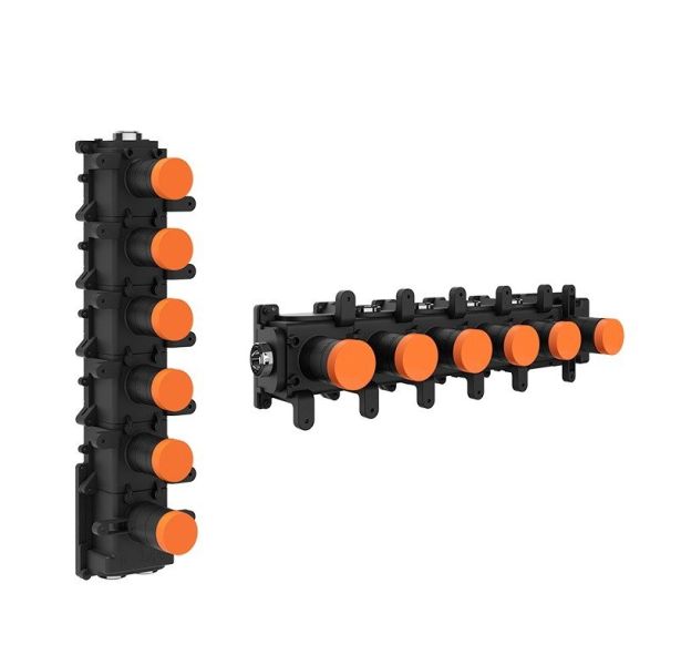 Модель оснащена пятью независимыми позициями, что обеспечивает гибкость при подключении и организации водных потоков. Такое решение подходит для сложных душевых систем, требующих распределения воды на несколько зон.