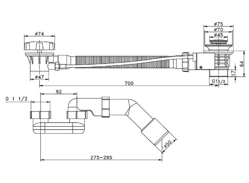 Сифон для ванны Сделан из высокопрочного пластика, который не боится экстремально высоких и низких температур, а также воздействия агрессивной бытовой химии. Подходит для большинства современных моделей ванн толщиной до 10 мм. Пробка слива и заглушка перелива хромированного цвета придадут вашей ванне элегантный и современный вид.