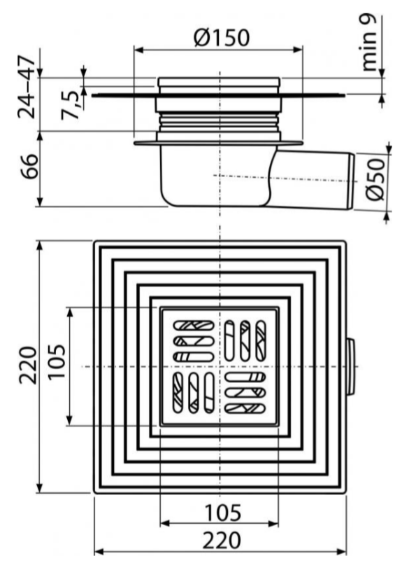 Сливной трап AlcaPlast 105 ? 105/50мм воротник – 2-х уровневая изоляция гидрозатвор – сухой для установки снаружи решетка - хром APV26C