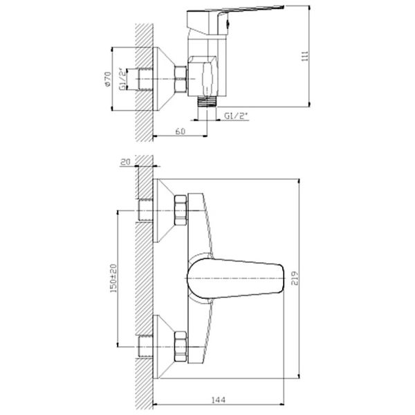 Смеситель для душа Rossinka S35-41, одноручный, хром. Аксессуары в комплекте (шланг 1,5 м, настенное крепление, 3-функциональная лейка с функцией легкой очистки). Присоединительная группа (эксцентрики с отражателями) для вертикального крепления.