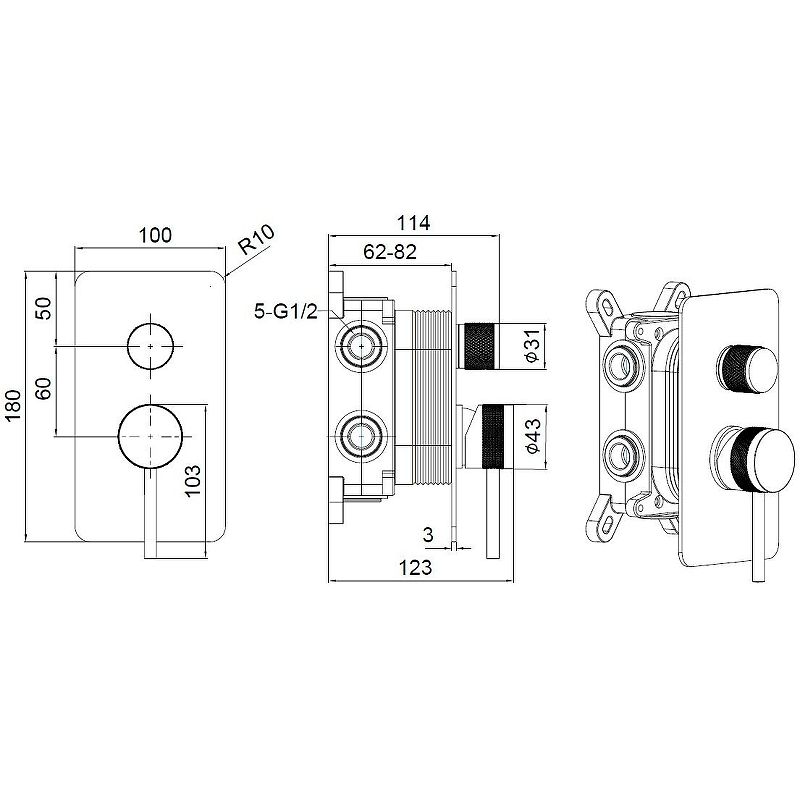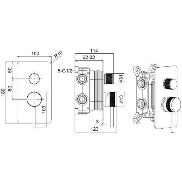 • Скрытая часть: латунь+EASY BOX, для 3х потребителей воды, дополнительно приобретается оборудование на 3 потребителя (Пример: №1 верх.душ + №2 душевой набор с водорозеткой + №3 излив или другие комбинации из 3х элементов)