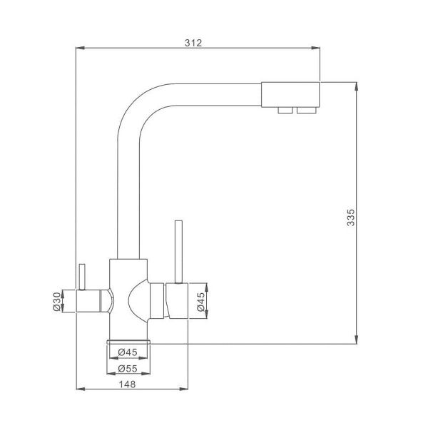 Смеситель для кухни Aquanika Comfort изготовлен из высококачественной латуни и оснащен поворотным изливом длиной 207 мм. Высота излива 255 мм. Излив смесителя является поворотным, а внутри него установлен излив для питьевой воды, поступающей через фильтр. Подача питьевой воды осуществляется по изолированному каналу и не соприкасается с обычной водопроводной водой. Включается подача питьевой воды отдельным рычагом (фильтр в комплект не входит). Смеситель совместим с любым стандартным фильтром.
