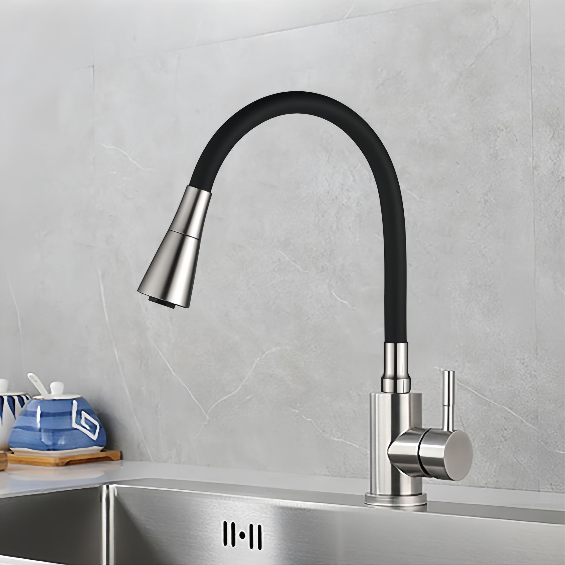 Cмеситель MIA BN из нержавеющей стали BOCH MANN BM10420 с гибким изливом черного цвета - уникальная модель, которая подходит для кухонных моек, раковин , умывальников. Силиконовый гибкий излив абсолютно безопасен, т.к он изготовлен из высококачественных материалов. Материал корпуса- нержавеющая сталь. Смеситель имеет керамический картридж 35 мм. Особенность данного смесителя - способность изменять форму и высоту излива, благодаря чему вы можете доставать до емкостей, находящихся рядом с мойкой. Излив надежно фиксируется и не деформируется от постоянных сгибов.