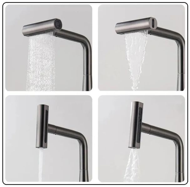 • Лейка имеет 4 режима: режим-1 "стандарт" (через аэратор), режим-2 "лезвие" (плоская струя с усиленным напором), режим-3 "ливень" (принцип душевой лейки); режим-4 "каскадный водопад"