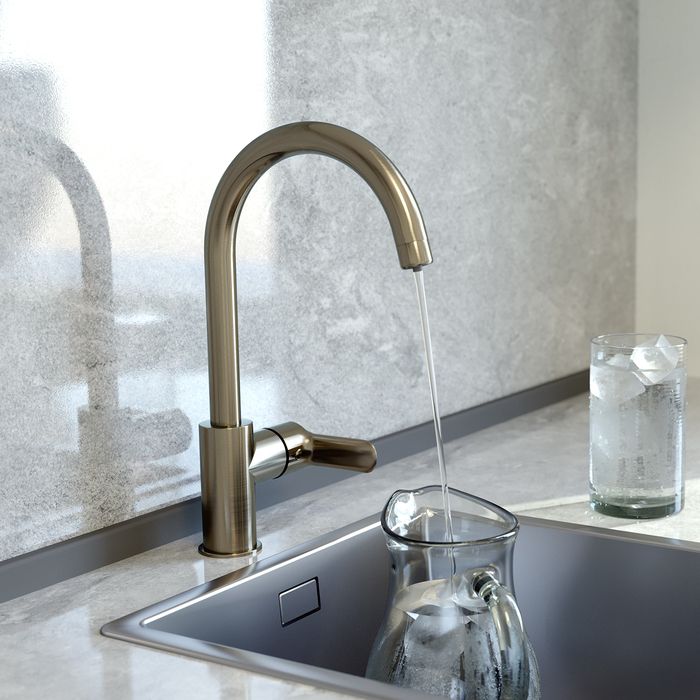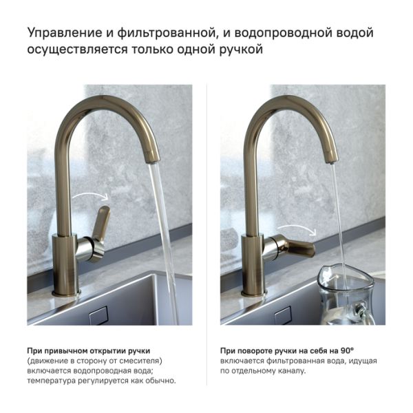 Смеситель для кухни Cuba в трендовом оттенке сатин с каналом для фильтрованной воды представляет уникальную технологию управления фильтрованной водой, которая практически не имеет аналогов. Теперь, чтобы налить стакан чистой воды, не нужна вторая ручка, — достаточно просто повернуть основную ручку в закрытом состоянии. Встроенный отдельный канал для фильтрованной воды позволяет, при подключении к любому фильтру, наслаждаться чистой питьевой водой прямо из смесителя. Нет необходимости устанавливать отдельный смеситель и сверлить под него отверстие.