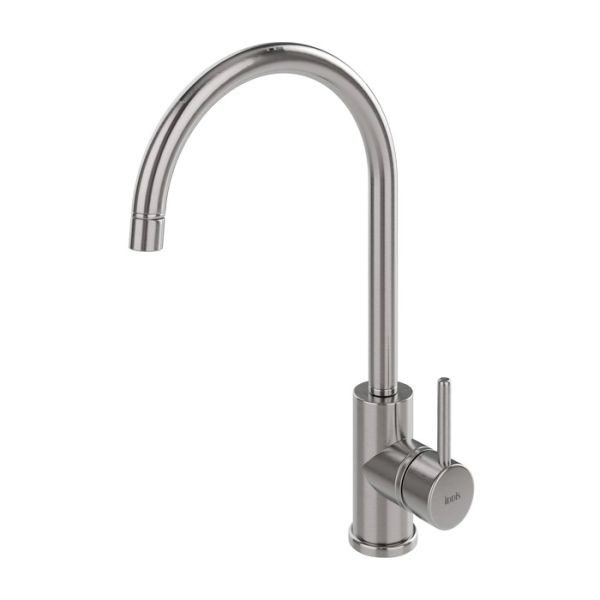 Смеситель для кухни из нержавеющей стали Kitchen универсального дизайна подойдет практически к любому интерьеру. Благодаря высокому поворотному изливу будет удобен в использовании даже с неглубокой мойкой.