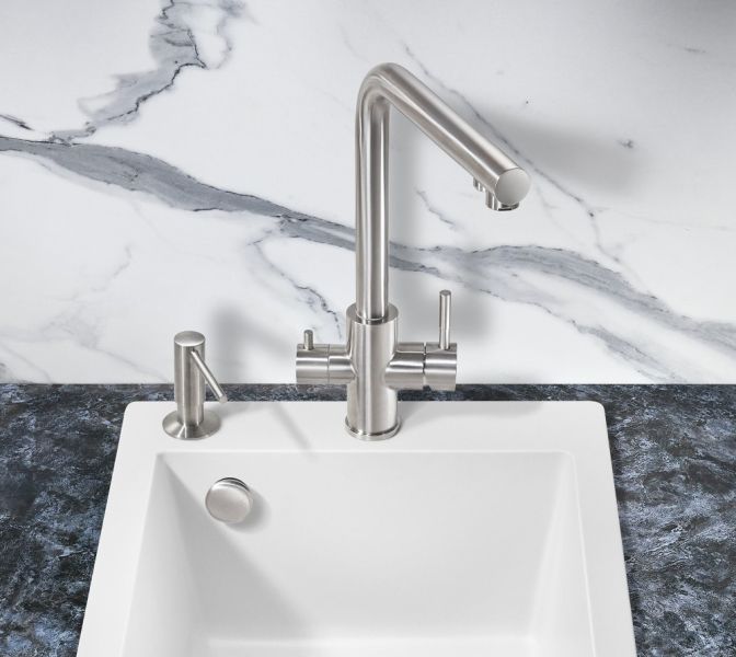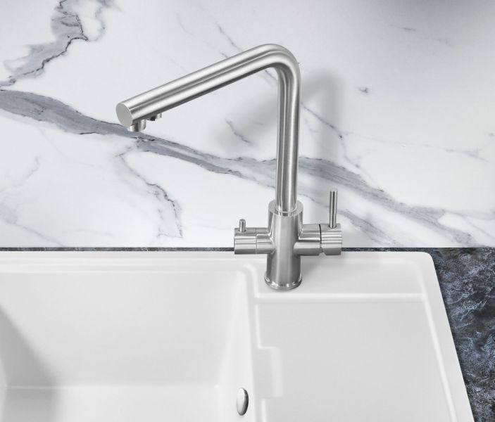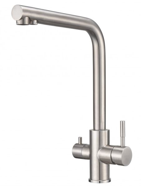 Один кран совмещает в себе две функции: подача воды для бытовых нужд + подача фильтрованной воды для питья. Два независимых друг от друга канала не только исключают возможность перекрестного смешивания воды, но и избавляют от необходимости устанавливать дополнительный кран для фильтра, что освобождает рабочее пространство и не перегружает общий вид кухни. Простая регулировка подачи обычной и питьевой воды осуществляется с помощью двух обособленных рычагов, установленных на одном корпусе (один рычаг — для бытовой воды, второй — для фильтрованной). Гибкая подводка идет в комплекте.
