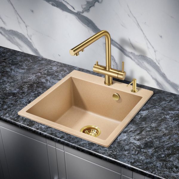 Модель выполнена в благородном цвете брашированного ( матового ) золота, которое достигается путём нанесения PVD, благодаря чему станет яркой, привлекающей внимание деталью на кухне и никого не оставит равнодушным.