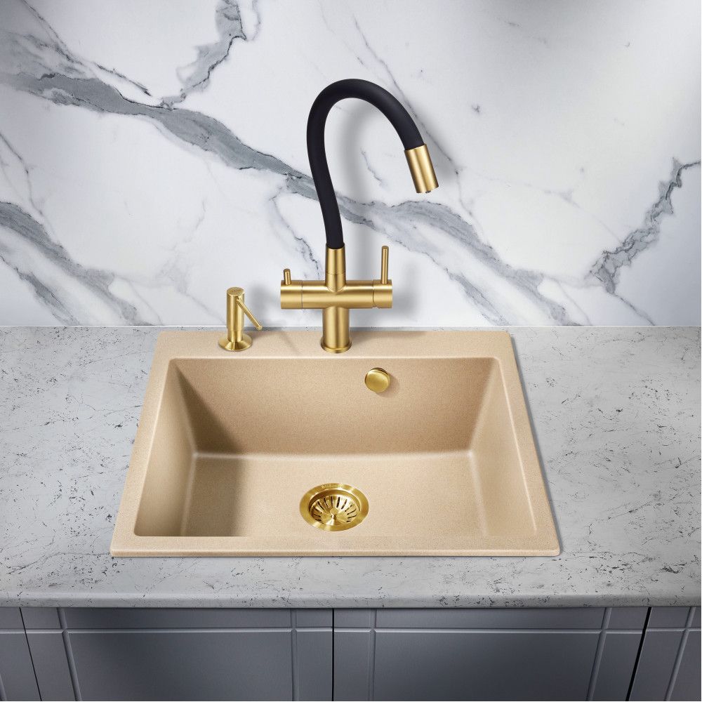 Модель выполнена в цвете брашированного золота и имеет изящный излив черного цвета, благодаря чему станет яркой, привлекающей внимание деталью на кухне и никого не оставит равнодушным.