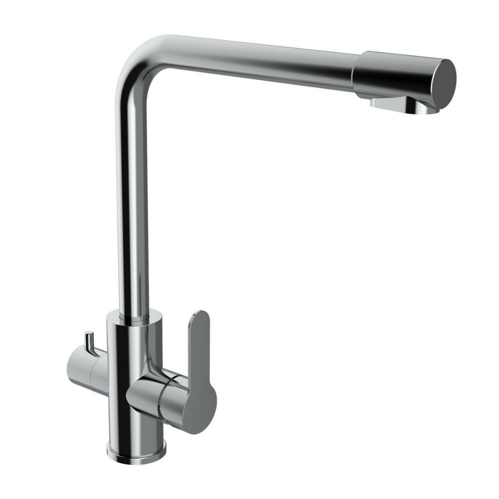 Смеситель для кухни (с керамическим картриджем) с возможностью подключения фильтра – эргономичное решение для современной кухни. Он изготовлен из латуни с хромовым покрытием, что обуславливает его надежность и долговечность. Два отдельных канала исключают смешивание водопроводной и фильтрованной воды. Высокий поворотный излив с аэратором обеспечивает комфорт при мытье посуды и предотвращает разбрызгивание. Для поддержания зеркального блеска поверхность достаточно вытереть насухо мягкой салфеткой.