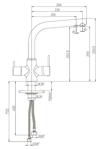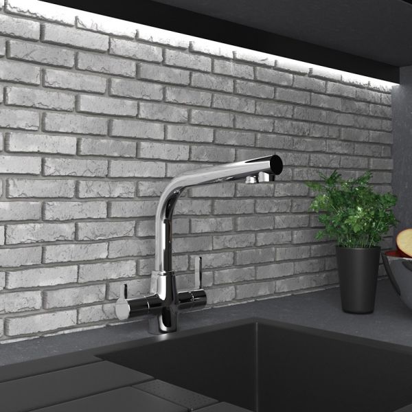 - Помимо стандартного рычага для управления температурой воды и открытия / закрытия, имеется рычаг для подачи фильтрованной воды.