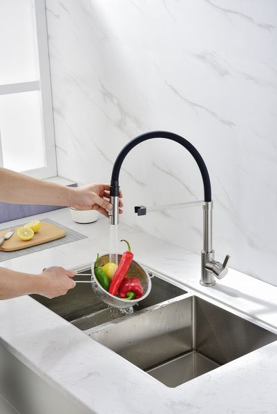 Смеситель для кухни, с гибким изливом, артикул Ha214021-NiИзготовлен из высококачественной латуни, которая отвечает высочайшим европейским стандартам качества, не содержит свинца, не разрушается со временем и безопасна для здоровья.
