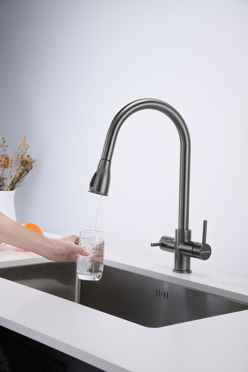 Смеситель под фильтрованную воду с выдвижным шлангом, артикул La214212-GMИзготовлен из высококачественной латуни, которая отвечает высочайшим европейским стандартам качества, не содержит свинца, не разрушается со временем и безопасна для здоровья.Вытяжной шланг