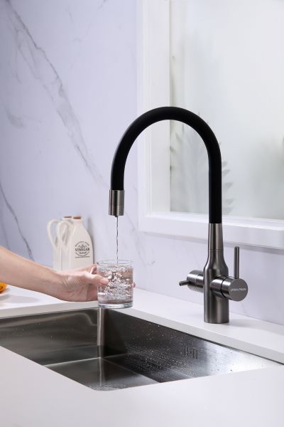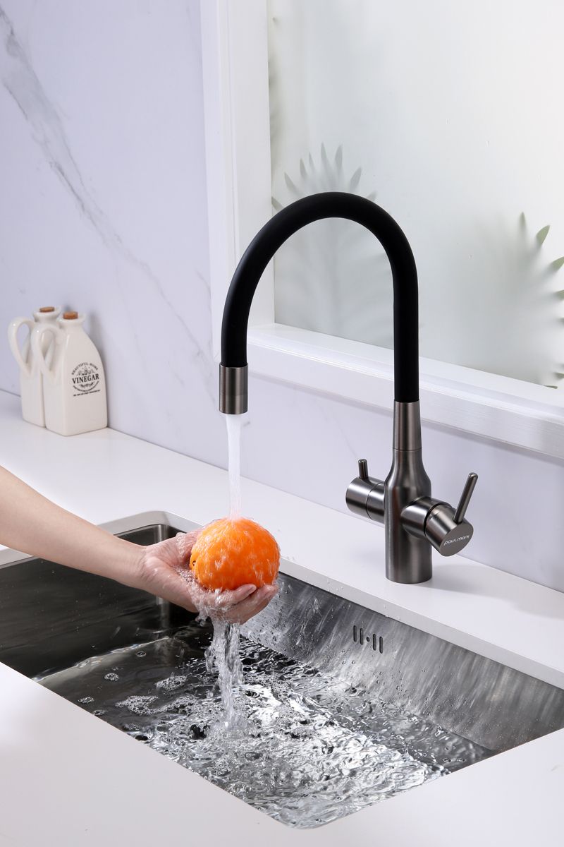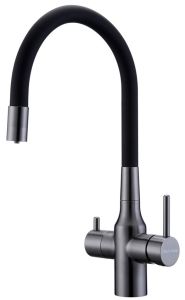 Смеситель под фильтр с гибким изливом, артикул Sa213419-GMСмеситель для кухни с возможностью подключения фильтра питьевой воды, эластичный излив с фиксацией.