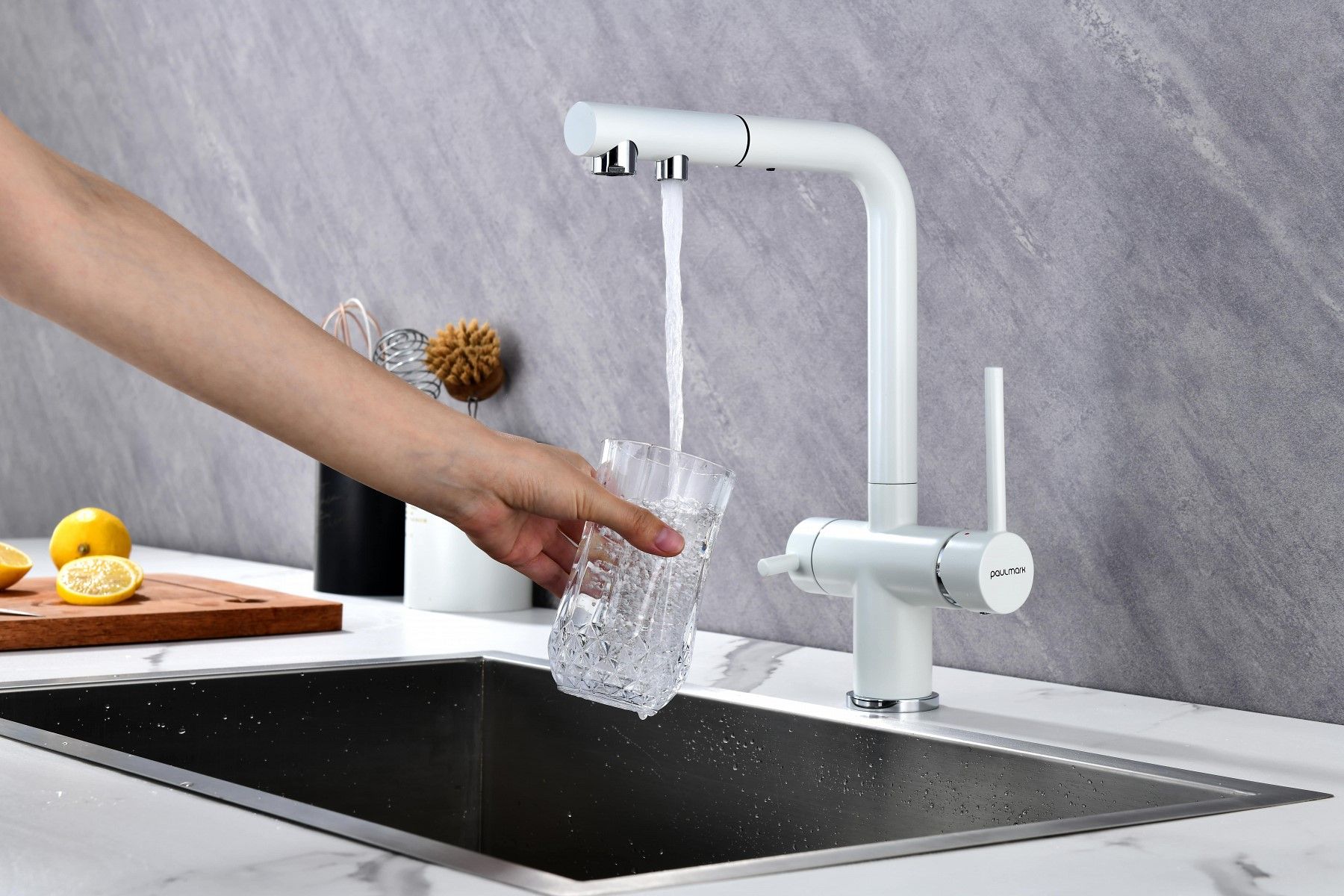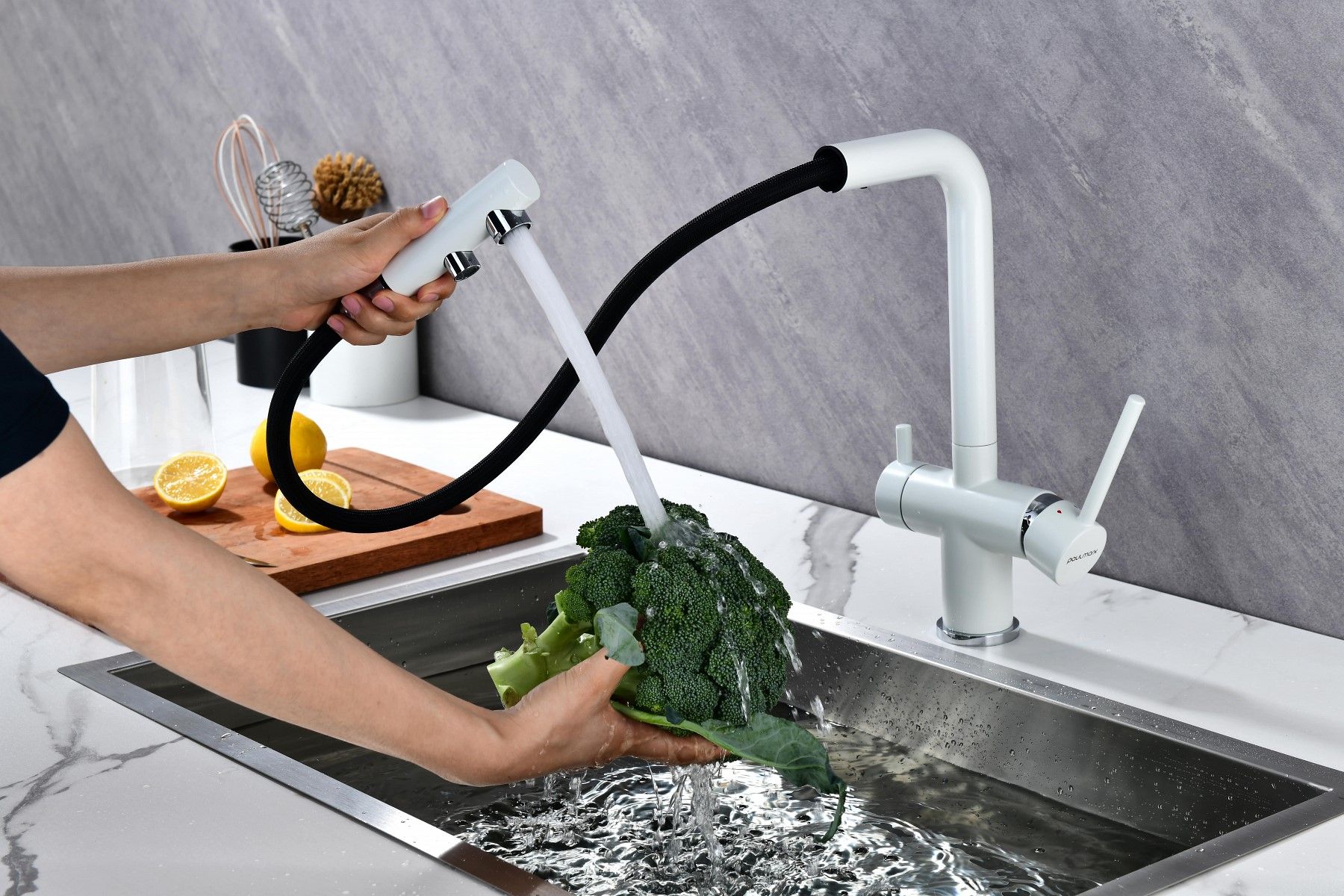 Смеситель для кухни с выдвижным изливом и возможностью подключения фильтра питьевой воды, артикул Se213222-431Изготовлен из высококачественной латуни, которая отвечает высочайшим европейским стандартам качества, не содержит свинца, не разрушается со временем и безопасна для здоровья.Смеситель для кухонной мойки SERPENTINE изготовлен из высококачественной латуни в классическом дизайне с изливом Г-образной формы. Излив поворотный на 180. Высота излива – 330 мм.