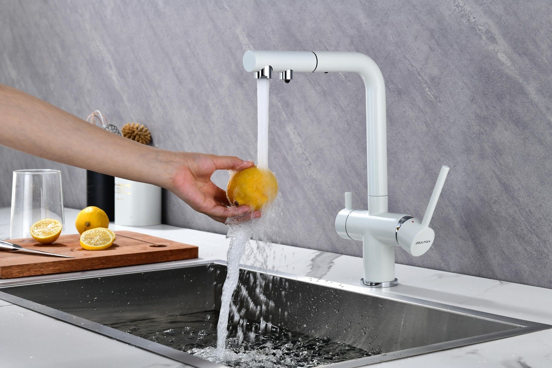 Смеситель оснащен гибким выдвижным изливом из нелойновой оплетки, которая обладает отличной устойчивостью к истиранию и разрушению. Данная техническая особенность расширяет рабочую зону смесителя, позволяя пользоваться им с удобством в больших мойках, мойках с двумя чашами, или наполнять водой ёмкость на столе рядом с мойкой, в том числе питьевой водой.