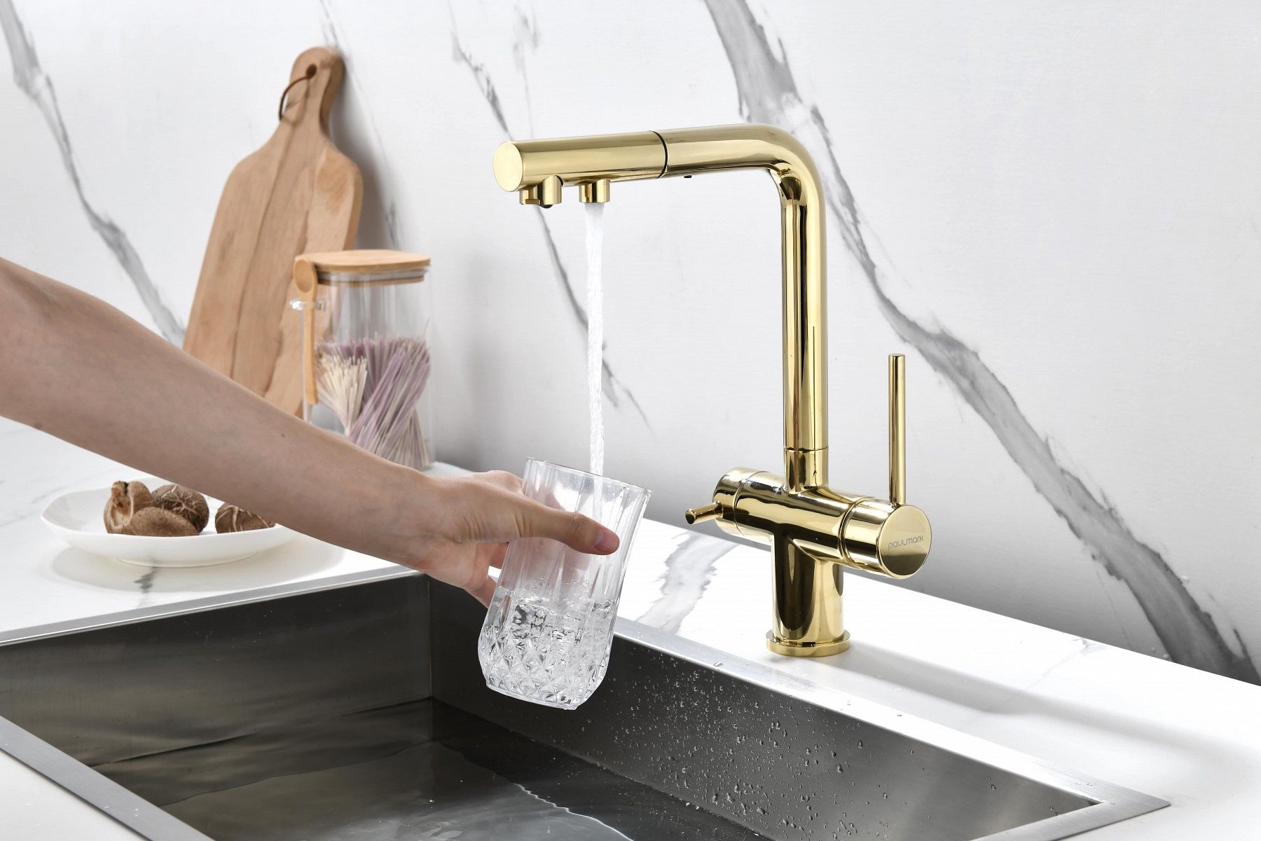 Смеситель для кухни с выдвижным изливом и возможностью подключения фильтра питьевой воды, артикул Se213222-GИзготовлен из высококачественной латуни, которая отвечает высочайшим европейским стандартам качества, не содержит свинца, не разрушается со временем и безопасна для здоровья.Смеситель для кухонной мойки SERPENTINE изготовлен из высококачественной латуни в классическом дизайне с изливом Г-образной формы. Излив поворотный на 180. Высота излива – 330 мм.