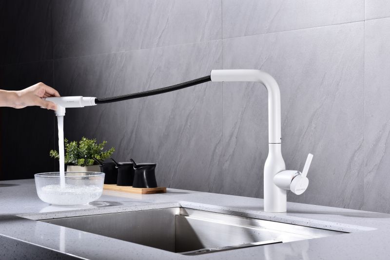 Высокий Г-образный излив с функцией вращения на 360 градусов обеспечивает удобство использования. Выдвижная часть излива способна обеспечить максимально комфортную эксплуатацию и экономный расход воды.