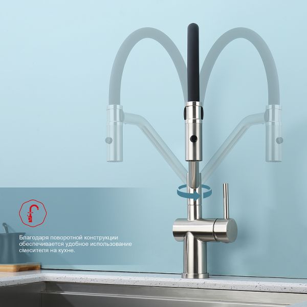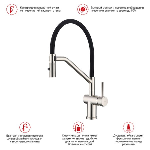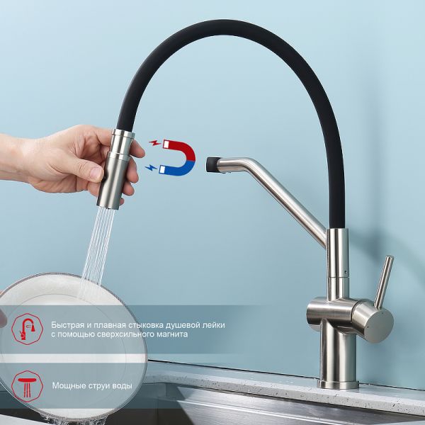 Смеситель для кухни со съемным изливом на магните. Кухонные смесители торговой марки RAGLO– это оригинальность и уют для каждого дома. Кран выполнен из высококачественных материалов, что гарантирует его долговечность и надежность. Эта сантехника отличается полезным функционалом, экологичными решениями, оригинальным стилем и легкостью монтажа. Поворотный излив позволяет с большим удобством пользоваться им на кухне. Оснащен гибкой системой подключения, что облегчает его монтаж и установку. Встроенный аэратор эффективно фильтрует примеси и уменьшает шум от импульсов воды. Гладкая внутренняя стенка обеспечивает мягкий поток воды. Подходит к кухонным мойкам практически любых размеров и форм. Кухонный смеситель является неотъемлемой частью любой кухни, и данный смеситель - отличный выбор для тех, кто ценит качество, надежность и комфорт.