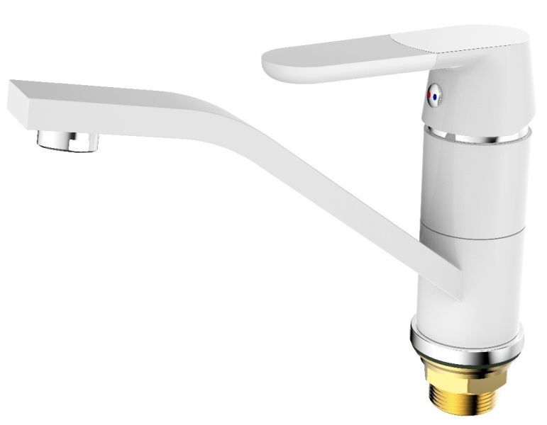 Надежный одноручковый смеситель для кухни с коротким поворотным изливом — это не только удобство в использовании, но и стильное сочетание белого и хромового покрытия.